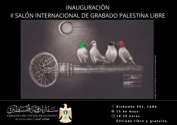 II Salón Internacional de Grabado Palestina Libre 2025. El evento conmemora los 77 años de la Nakba Palestina. Se podrán ver obras originales e inéditas, firmadas como prueba de artista y con la temática exclusivamente de Palestina. Inaugura este jueves 15 de mayo con entrada libre y gratuita, a las 18:30 en la Embajada de Palestina. Riobamba 981, CABA.