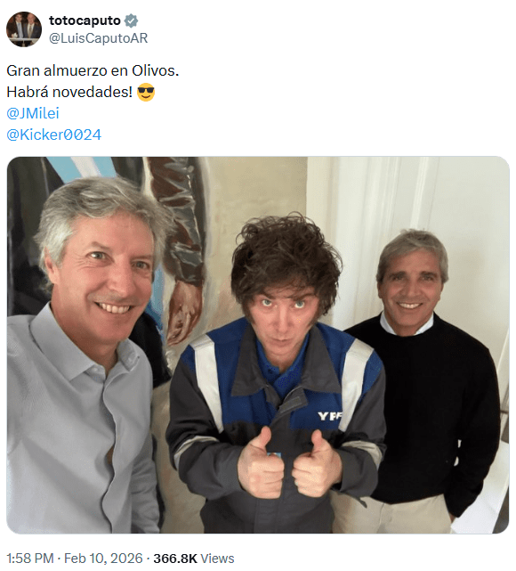 La escena fue simple. Una foto. Luis “Toto” Caputo, Javier Milei y el presidente del Banco Central, Santiago Bausili, sonrientes. La publicó el propio ministro con una frase breve: “Gran almuerzo en Olivos, habrá novedades”. Alcanzó. En pocas horas el mercado hizo lo que mejor sabe hacer cuando no hay información: llenar el vacío con expectativas. Y las expectativas, en la Argentina, suelen cotizar más que los hechos.