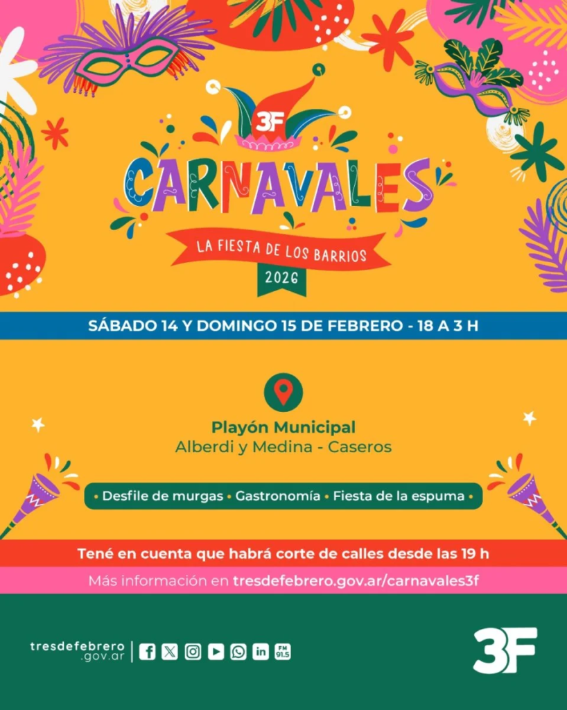 Carnaval 2026 en Tres de Febrero: shows en vivo, gastronomía, desfile de murgas y fiesta de la espuma.