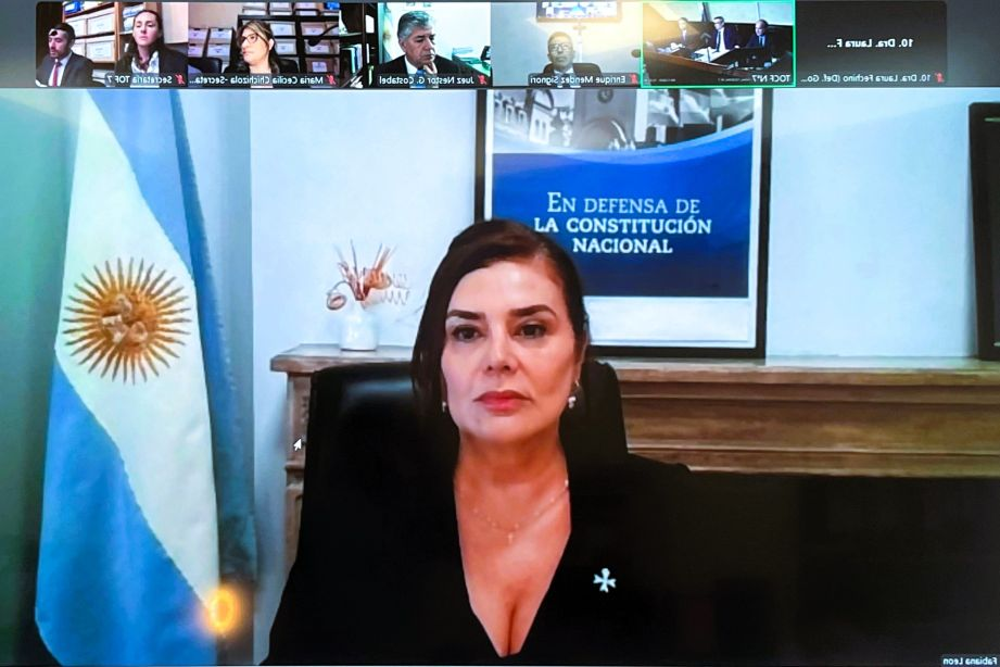 La fiscal general Fabiana León, durante la transmisión de la audiencia inicial del juicio de la causa Cuadernos.