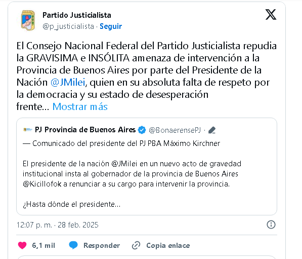 A ese mensaje se sumó Cristina Kirchner, que retuiteó un comunicado que se emitió un rato después desde el PJ Nacional. “El Consejo Nacional Federal del Partido Justicialista repudia la gravísima e insólita amenaza de intervención a la provincia de Buenos Aires por parte del presidente de la Nación, Javier Milei, quien -en su absoluta falta de respeto por la democracia y su estado de desesperación frente a los escándalos de público y notorio conocimiento- intenta un golpe institucional contra la Provincia y su gobernador Axel Kicillof. Compartimos y hacemos nuestra la publicación del PJ de la provincia de Buenos Aires”, sostuvo el texto.