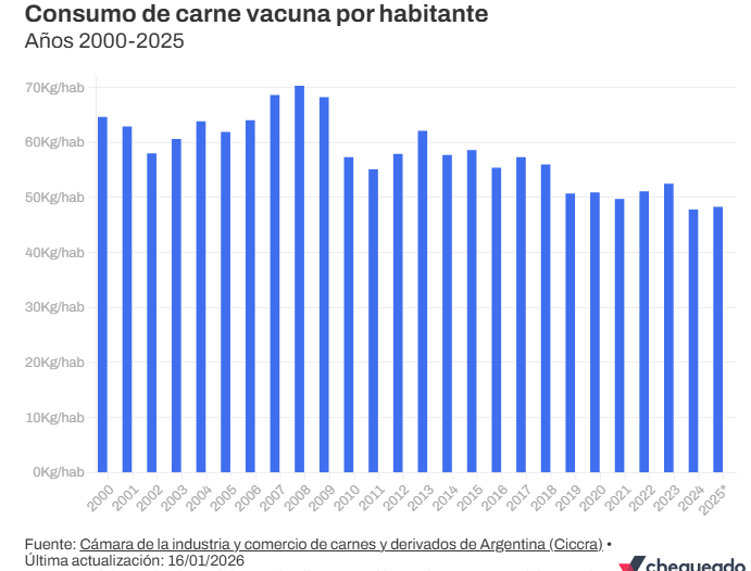 De acuerdo con la entidad, entre enero y noviembre de 2025 se consumió un promedio de 48,3 kilos de carne vacuna por persona, mientras que en 2024 el promedio había sido de 47,8 kilos y en 2023, 52,5 kilos.