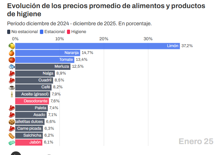 Si se tiene en cuenta el desglose por productos, 5 cortes de carne se encuentran entre los 6 elementos que más aumentaron el año pasado: el cuadril (72,6%), la paleta (71,2%), la nalga (69,7%), el asado (69,4%) y la carne picada (59,9%).