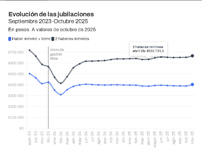 En este escenario, la jubilación mínima con bono de noviembre de 2025 se ubica un 6,1% real por debajo de noviembre de 2023 (último mes completo de la gestión del Frente de Todos).