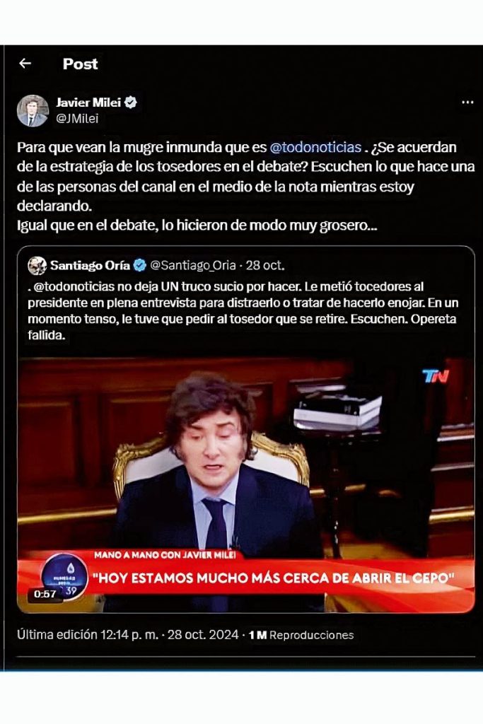 Estos son apenas algunos ejemplos de temas espinosos que jamás aparecen, y que a las claras revisten un interés público (cuando Massa le tiró en cara a Milei sus reiterados plagios durante el debate, el tema se convirtió en lo más buscado aquella noche en Google). De hecho, estos asuntos candentes hacen algo más que no aparecer en las entrevistas con Milei. En algunos casos son retomados por los periodistas, pero en forma de defensa del libertario. “El Gobierno está tocando intereses pesados. Por eso, van a seguir diciendo que Milei está loco. Cuantas más cajas toque, más loco va a estar. Por eso van a decir que habla con los perros”, escribió Viale en una nota. La relación del Presidente con el periodismo también tiene eco en este grupo.