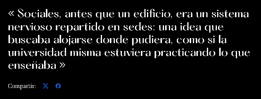 La dirección era precisa (Marcelo T. de Alvear 2230), pero la sensación era siempre un poco clandestina. Más por precariedad que por conspiración. Un bastión demasiado plebeyo o “zurdo” invadiendo el margen izquierdo de un barrio de gente de bien como la Recoleta. Sociales, antes que un edificio, era un sistema nervioso repartido en sedes: una idea que buscaba alojarse donde pudiera, como si la universidad misma estuviera practicando lo que enseñaba: que las instituciones también sobreviven a fuerza de remiendos y de peleas por la unidad.