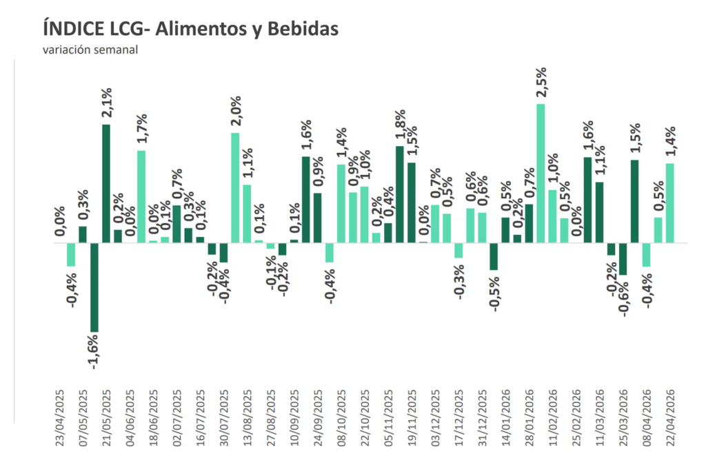 El reporte más duro fue de la consultora LCG: marcó un incremento del 1,4% en alimentos y bebidas durante la tercera semana, un importante salto respecto de elevamientos anteriores, en que había registrado un aumento del 0,5% en la segunda e incluso deflación de 0,4% en la primera semana del mes. Con este dato, la inflación promedio de las últimas cuatro semanas cortó la racha de descensos que tenía desde febrero y aceleró 0,3 puntos porcentuales (p.p.) a 1,5 por ciento.