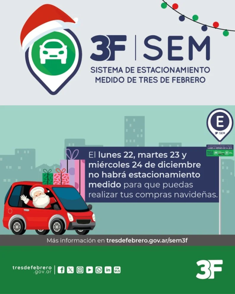 Através de sus redes sociales oficiales, desde el Municipio de Tres de Febrero anunciaron que para que los vecinos puedan realizar sus compras navideñas no habrá estacionamiento medido en Caseros y Ciudadela Sur.