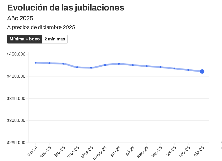 De acuerdo con los datos oficiales, en diciembre de 2025 la jubilación mínima fue de $ 340.879. A esto se le debe sumar el bono de $ 70 mil que el Gobierno nacional mantiene sin cambios desde el mes de marzo de 2024, con lo que un beneficiario que cobra la mínima percibió $ 410.879 a fin de 2025.