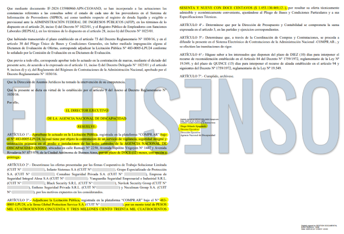 La investigación periodística también expone que la ANDIS pagó la suma de $1.453.130.469,12 a la empresa Global Protection Service, de Nicolás Hazaff, por un año de servicios de seguridad en tres sedes de CABA. El contrato lleva la firma de Spagnuolo.