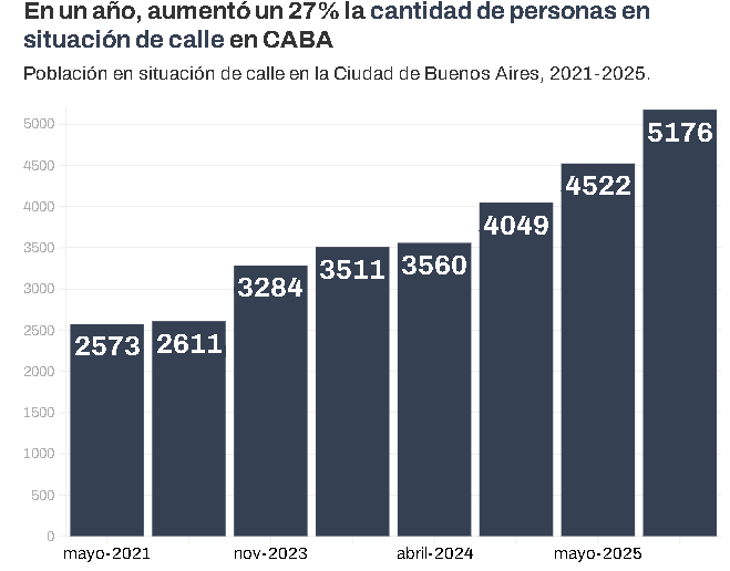 En noviembre de 2024 había 4.049 personas en situación de calle en la Ciudad de Buenos Aires. Un año después, el relevamiento oficial, realizado por el Ministerio de Desarrollo Humano y Hábitat porteño, arrojó un total de 5.176.