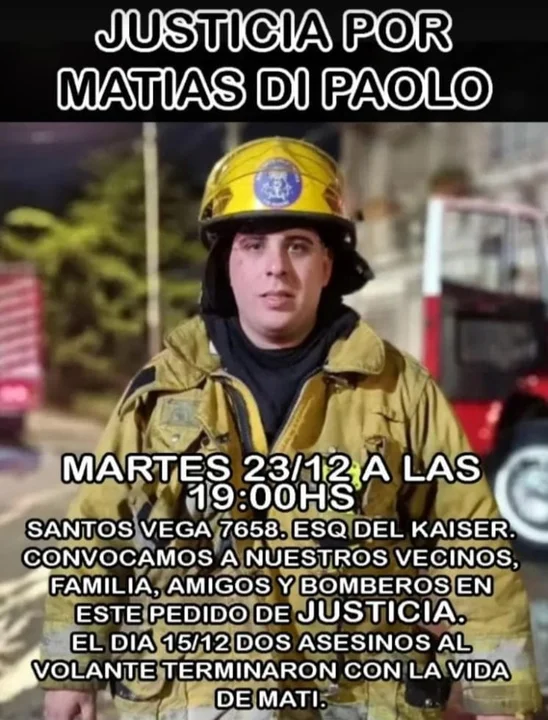 Una marcha se realizará en la localidad bonaerense de Tres de Febrero el próximo martes para pedir justicia por la muerte de Matías Di Paolo, el bombero que hace una semana fue atropellado junto con sus compañeros mientras apagaban un incendio.