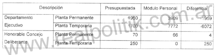 En materia de personal, el organismo detectó diferencias sustanciales entre la planta aprobada por ordenanza y los datos cargados en el módulo de Administración de Personal del sistema RAFAM. El departamento ejecutivo tenía presupuestados 1.950 cargos de planta permanente, mientras que el sistema reflejaba 3.908, lo que implicó una diferencia de 1.889 cargos. También se verificaron inconsistencias en la planta temporaria y en el Honorable Concejo Deliberante. Aunque el municipio sostuvo que no se habían excedido los cargos autorizados y que se trataba de errores técnicos en proceso de corrección, la Relatoría confirmó la observación por incumplimiento normativo.