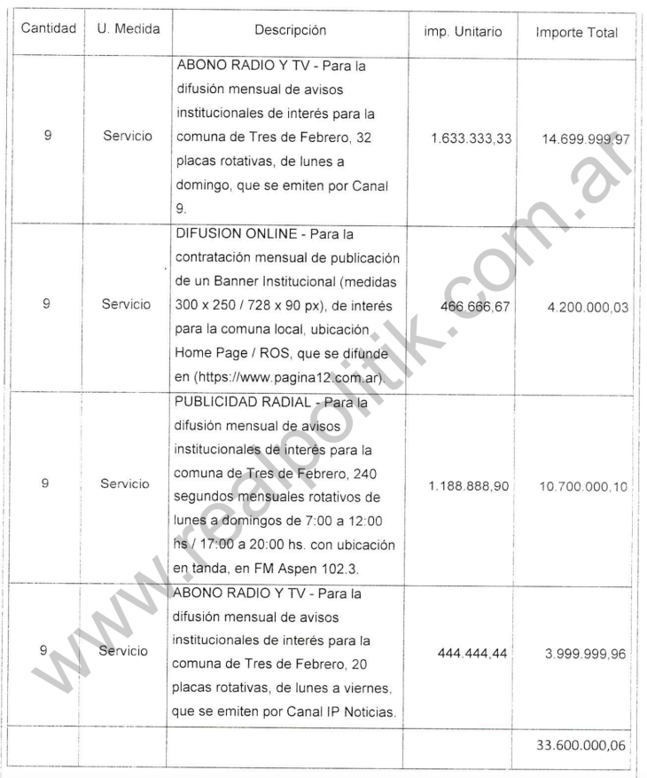 En la compra directa Nro. 104 (expediente 4117-48663/2024) se adjudicó por 33.600.000 al proveedor Martin Rodriguez la difusión mensual de avisos institucionales en El Nueve, Canal IP Noticias, FM Aspen 102.3 y el portal Página/12. El Tribunal observó que la contratación fue encuadrada como excepción bajo el artículo 156 inciso 4 de la Ley Orgánica de las Municipalidades cuando, según el análisis técnico, no correspondía aplicar ese régimen. Además, se detectó una incorrecta utilización de la unidad de medida, tanto en la solicitud de pedido como en la orden de compra.