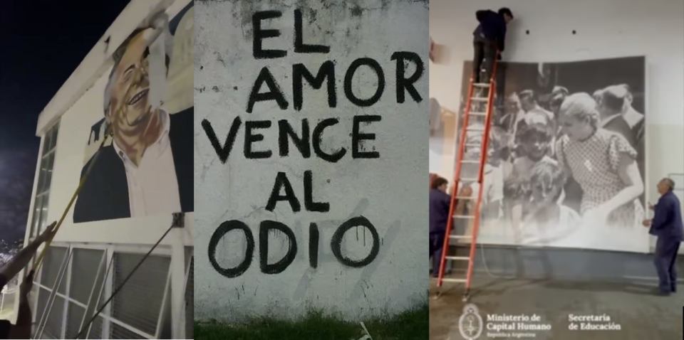 Con el ascenso de Javier Milei a la presidencia, se desató un feroz ataque contra los símbolos del peronismo: se cambió el nombre del Centro Cultural Kirchner por “Palacio Libertad”, se rebautizó el gasoducto Néstor Kirchner, y se eliminaron imágenes de Evita y Perón de edificios públicos. Incluso se anunció la demolición del edificio con el emblemático mural de Evita en la avenida 9 de Julio. Además, se retiraron las jubilaciones de Cristina y Amado Boudou, pero se mantuvieron intactas para las viudas de Menem y De la Rúa.
