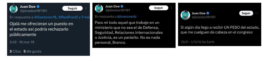 La identidad detrás de otras cuentas verificadas fue revelada por notas periodísticas u otros usuarios de X, aunque no se les haya comprobado un empleo público. @TraductorTeAma es Esteban Glavinich, hijo de una familia agropecuaria de Santa Fe, que aparece en una foto con Diana Mondino. Según un hilo del usuario SIDE twitera y algunas crónicas periodísticas, su madre cobraba entre 2.000 y 3.000 dólares del municipio de Cañada de Gómez por “estudios de opinión”, y su padre fue Subsecretario de Comunicación Social del Gobernador Jorge Obeid. De Santa Fe, Rosario, también es El Buni, Franco Buoniconto, un joven que en vive de monetizar contenidos detrás de la cuenta @TheRealBuni y estuvo en el acto de cierre de campaña de Milei. @ElTrumpista, según el diario La Nación sería un uruguayo de nombre Luciano Cabrera con su cuenta radicada en Estados Unidos, mientras que el mencionado @agarra_pala podría ser Franco Antúnez, el youtuber golpeado durante la marcha universitaria bajo el seudónimo Franfijap.
