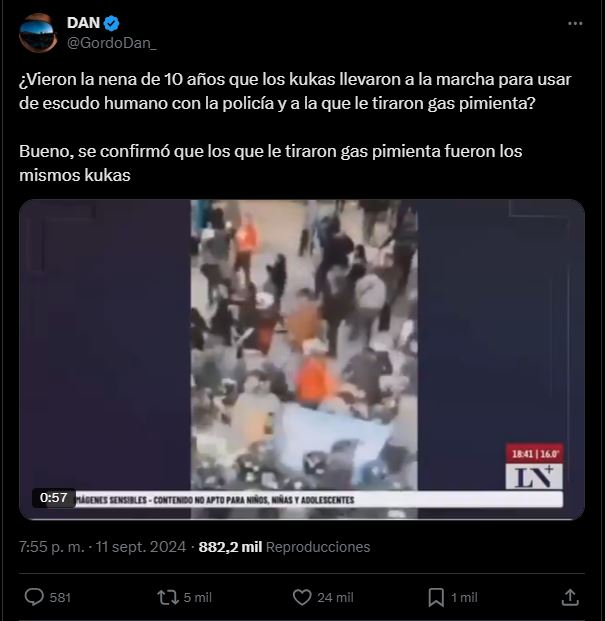 Con el video apócrifo como insumo, los engranajes empiezan a moverse otra vez. A las 19:41, la cuenta anónima Hombre Gris (@hombregrisxd) culpa a “los piqueteros del [líder del Polo Obrero Eduardo] Belliboni” por la agresión. Pide “difundir a full”. Once minutos después, el Presidente Milei repostea un tuit del usuario @JMileiElecto que repite lo mismo, y a las 19:56 el Gordo Dan aporta el suyo: “¿Vieron la nena de 10 años que los kukas llevaron a la marcha para usar de escudo humano con la policía y a la que le tiraron gas pimienta? Bueno, se confirmó que los que le tiraron gas pimienta fueron los mismos kukas”. Su posteo tendrá 881.000 vistas y 5.000 compartidas, convirtiéndose en la bala digital de mayor impacto de la jornada. Esa noche, en el prime time televisivo, los periodistas afines al gobierno repiten la noticia y la secretaria de Seguridad, Alejandra Monteoliva, segunda de Bullrich, transforma la mentira en versión oficial: “las imágenes se analizaron y no estaba la presencia de la policía en este momento. Evidentemente fue un gas que arrojaron estas personas que estaban en proximidad a ella”.
