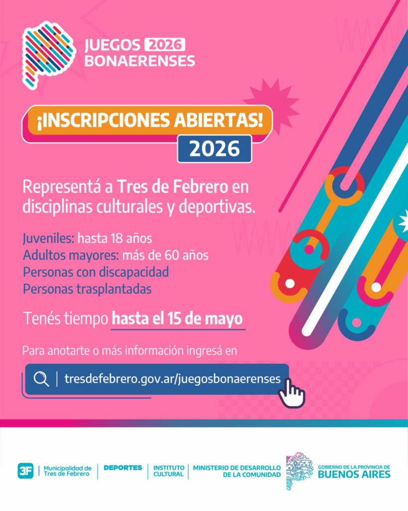 Comenzó la inscripción para participar de los Juegos Bonaerenses 2026, una de las competencias más importantes de la provincia que promueve el deporte, la cultura y la inclusión. Es por eso, que desde el municipio te invitamos a sumarte a esta propuesta y representar a Tres De Febrero. Tenés tiempo de inscribirte a esta nueva edición hasta el viernes 15 de mayo, la inscripción es libre y gratuita. Ingresá acá para participar de las disciplinas culturales y deportivas.